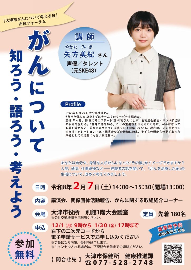 今年の「大津市がんについて考える日」市民フォーラムでは、がん経験者でもある元SKE48の矢方美紀さんの講演会や、がんに関する取組紹介などを企画しています。