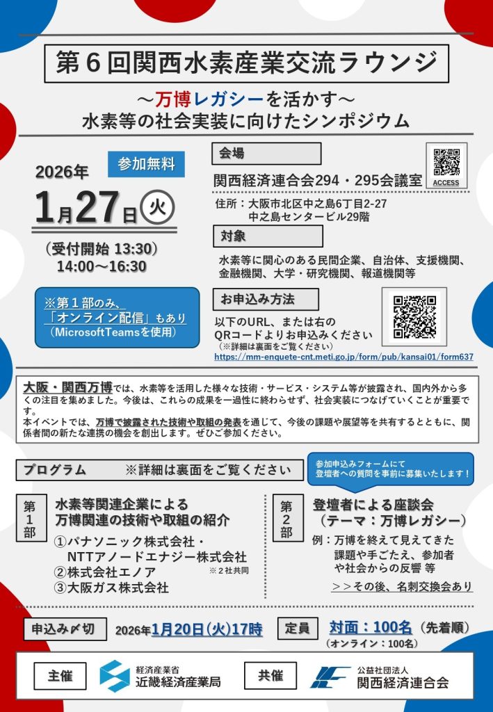 近畿経済産業局では、2025年大阪・関西万博で展示された水素等の技術を一過性のものに終わらせず、社会実装へつなげるため、このたび、万博で活用された技術や取組の共有及び関係者間のネットワーク構築を目的に「~万博レガシーを活かす~水素等の社会実装に向けたシンポジウム」(第6回関西水素産業交流ラウンジ)を開催します。