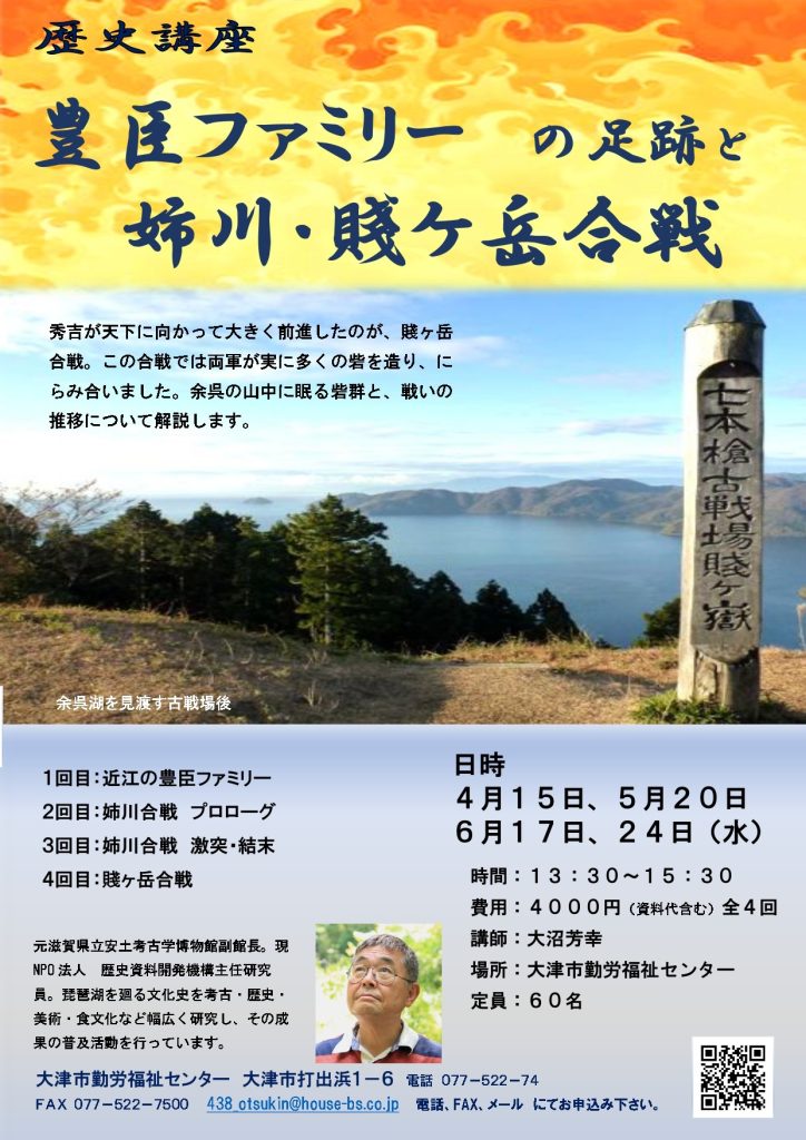 2~4回:信長と浅井・朝倉軍が激突した「姉川合戦」と、秀吉が天下人に向かって大きく前進する事になる「賤ヶ岳合戦」について、湖北を舞台に繰り広げられた戦いの原因、推移、結果を解説します。
